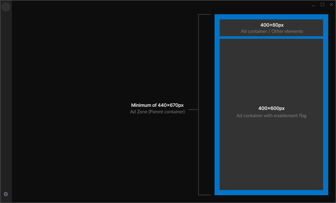 <div>) of 440x670px. An ad zone (parent container) may contain one or more individual ad containers.